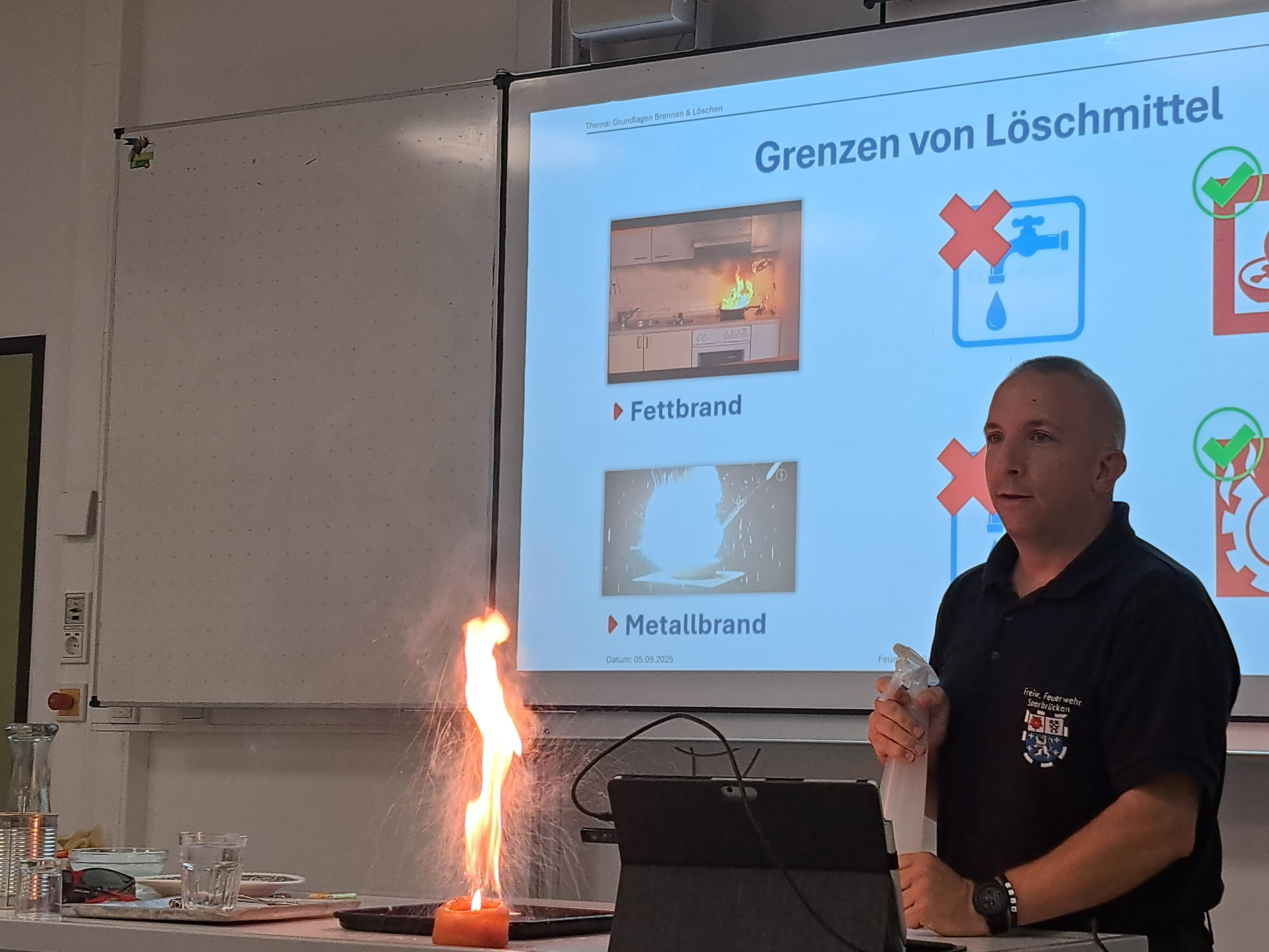 Mit viel Getöse, Stichflammen und kleinen Explosionen endete für die Schüler:innen des bundesweit einzigartigen und neuen Blaulicht-Schulfachs das theoretische Unterrichtsmodul „Brennen & Löschen“ im Chemiesaal unserer Schule. Während der Unterrichtsstoff zu den Theoriebausteinen „Feuer“, „Verbrennungsdreieck“, „Löschmittel“ und „Brandklassen“ in den letzten beiden Wochen vermittelt wurden, ging es nun im Chemiesaal richtig zur Sache. Zu Gast war die Freiwillige Feuerwehr Saarbrücken, vertreten durch den Löschbezirk 13, Sankt Johann, welche sehr anschaulich und auf die Lebenswirklichkeit der Schüler:innen Bezug nehmend in zahlreichen brandheißen Experimenten den sicheren Umgang mit Feuer schulte und die Gefahren beim Einsatz ungeeigneter Löschmittel demonstrierte.