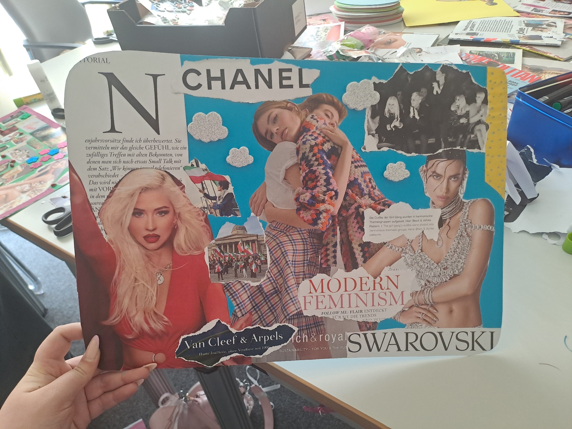 An Tag 3 wurde es kreativ: Ein Moodboard zu einem aus drei Themen durfte erstellt werden mithilfe von Zeitschriften: spring vibes, all about colour oder your aesthetic. Anschließend bekamen die Schüler:innen in Gruppen ein Thema: Party, Rockkonzert oder Prom. Dafür durften sie im gesamten Laden innerhalb einer Stunde ein komplettes Outfit zusammensuchen und präsentieren. Wer Spaß an Fashion hat und kommunikativ ist, kann sich gerne für das Praktikum bei P&C online bewerben.